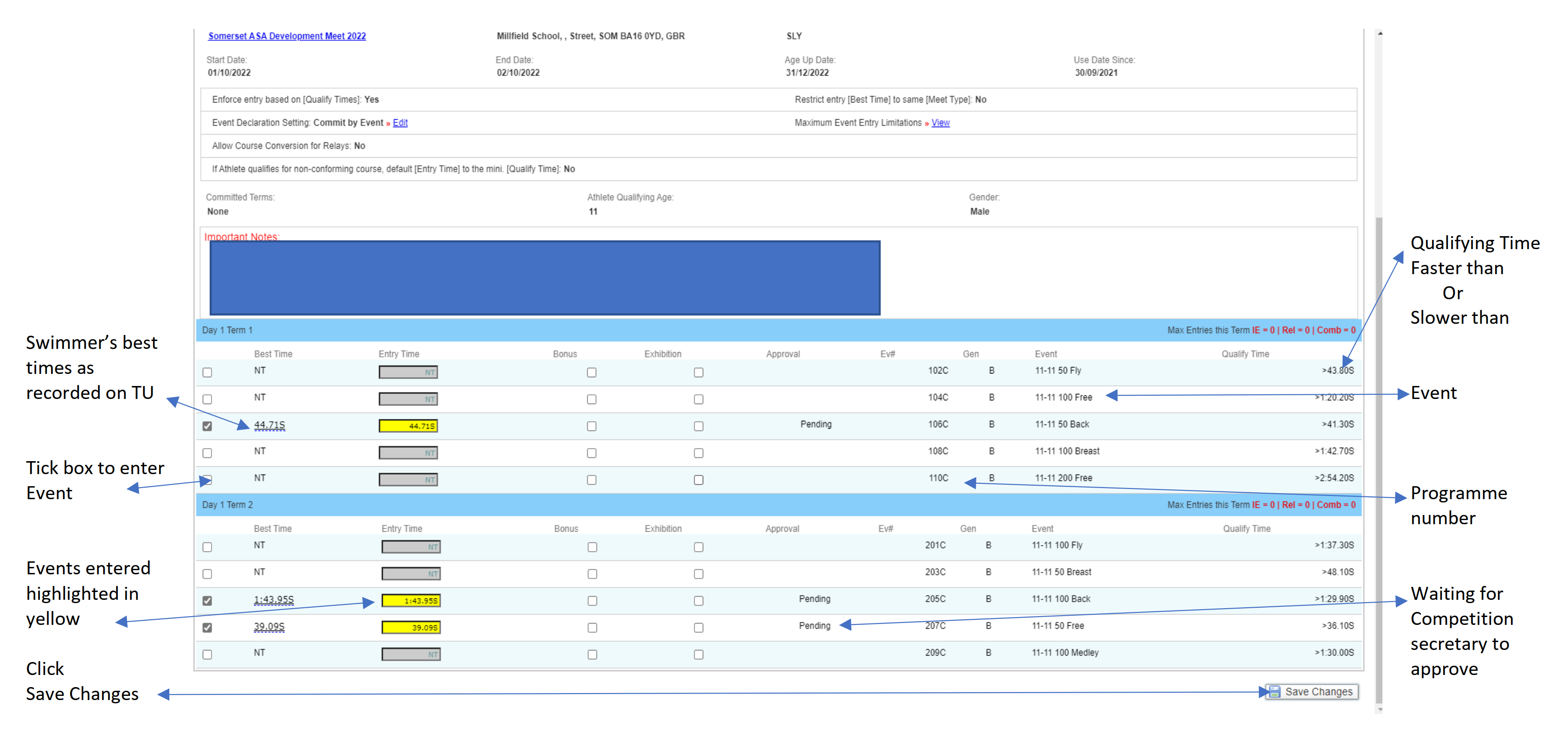 After our closing date, a draft list of entries will be emailed out for you to double-check. Once this is confirmed, the club submits the final entry to the meet organisers.